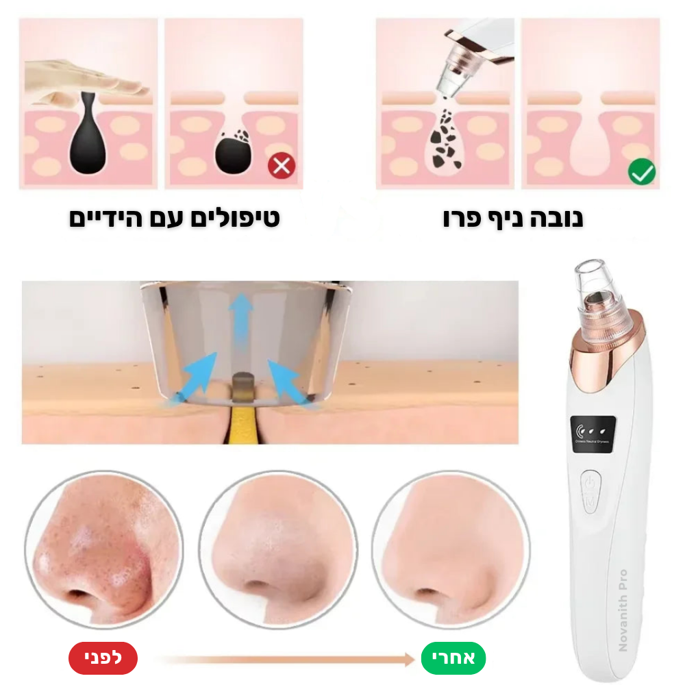 המכשיר שלנו פועל באמצעות טכנולוגיית שאיבה עדינה שמייצרת ואקום ממוקד סביב הנקבוביות. התהליך מושך החוצה את השחורים, הלכלוך והשומן העודף מבלי לפגוע בעור או לגרום כאב.